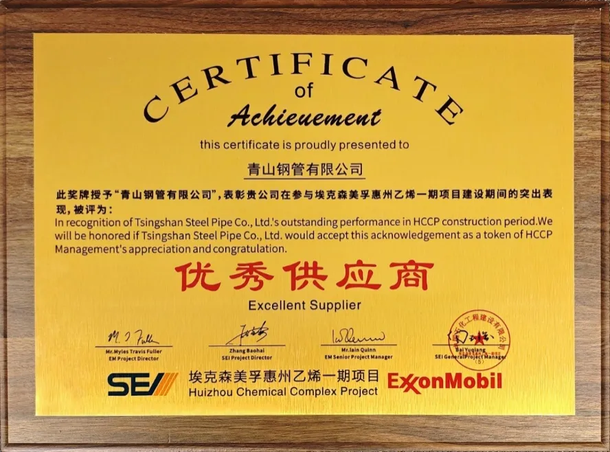 近日,青山鋼管有限公司憑借其卓越的產品質量、專業(yè)的技術實力和及時高效的售后服務,榮獲中石化SEI埃克森美孚惠州乙烯一期項目的“優(yōu)秀供應商”稱號。
