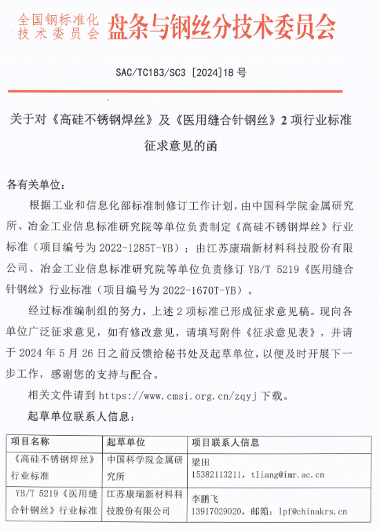 4月25日,由中國科學(xué)院金屬研究所、冶金工業(yè)信息標(biāo)準(zhǔn)研究院等單位負(fù)責(zé)制定《高硅不銹鋼焊絲》行業(yè)標(biāo)準(zhǔn)(項(xiàng)目編號(hào)為2022-1285T-YB)已形成征求意見稿。