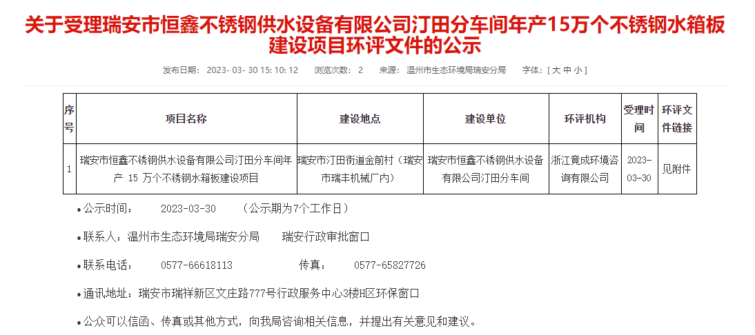 3月30日,溫州市生態(tài)環(huán)境局瑞安分局受理瑞安市恒鑫不銹鋼供水設(shè)備有限公司汀田分車間年產(chǎn)15萬個(gè)不銹鋼水箱板建設(shè)項(xiàng)目環(huán)評(píng)文件并對(duì)外進(jìn)行公示,公示期為7個(gè)工作日。